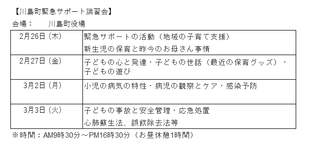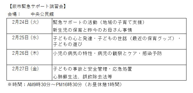 緊急サポート事業では、子育て中のお母さん、お父さんの育児のお手伝いをしてくださるサポート会員の募集をおこなっております。子育て経験があれば、資格、年齢は問いません。(20代~70代の方が活躍しています)保育の仕方や病気のことなど、実践的なスキルを学ぶため、4日間の講習を受けていただきます。